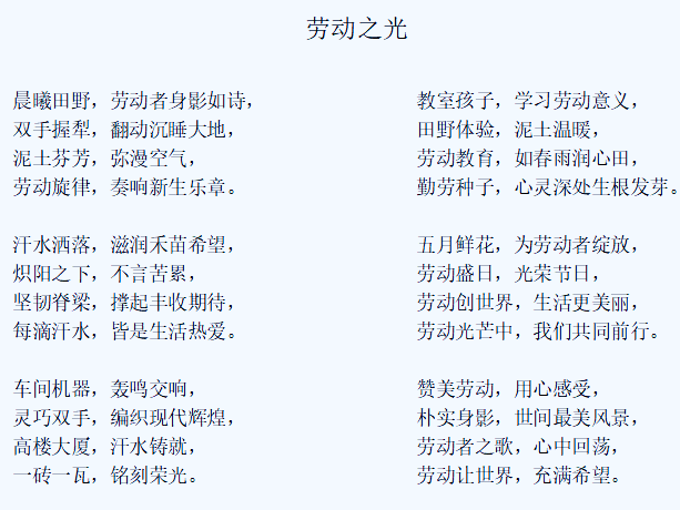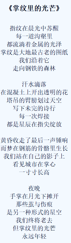 在团总支宣传部策划的“劳动铸就梦想”主题文学作品征集活动中,60余篇饱含深情的诗歌、散文等作品如春笋涌现。从《青年劳动歌》到《蓝图褶皱处生长》,从《掌纹里的光芒》到《劳动之光》,青年学子以笔为犁,在方寸纸笺间耕耘出对劳动价值的深刻思考。