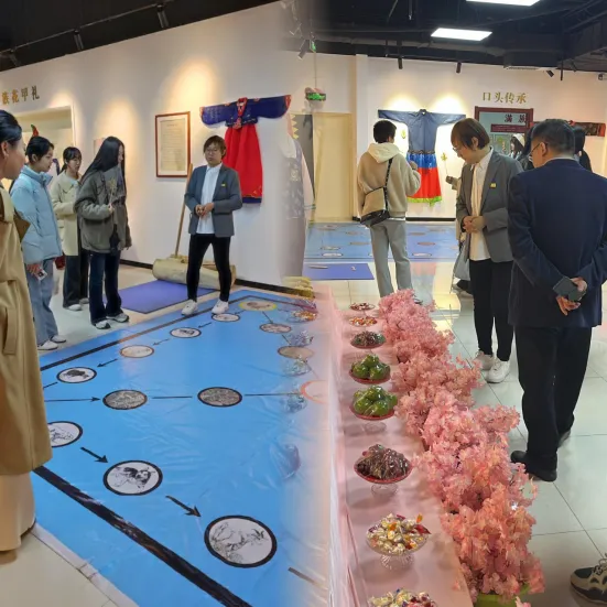 同学们分批次参观了非遗馆的“匠心技艺”“地域民俗”等展厅,重点体验了宁古塔泥塑、关东剪纸、满族刺绣(如渤海靺鞨绣)、木雕、糖画等非遗项目。在非遗传承人的指导下,同学们动手制作了糖画等作品,并学习了传统技艺的制作流程。