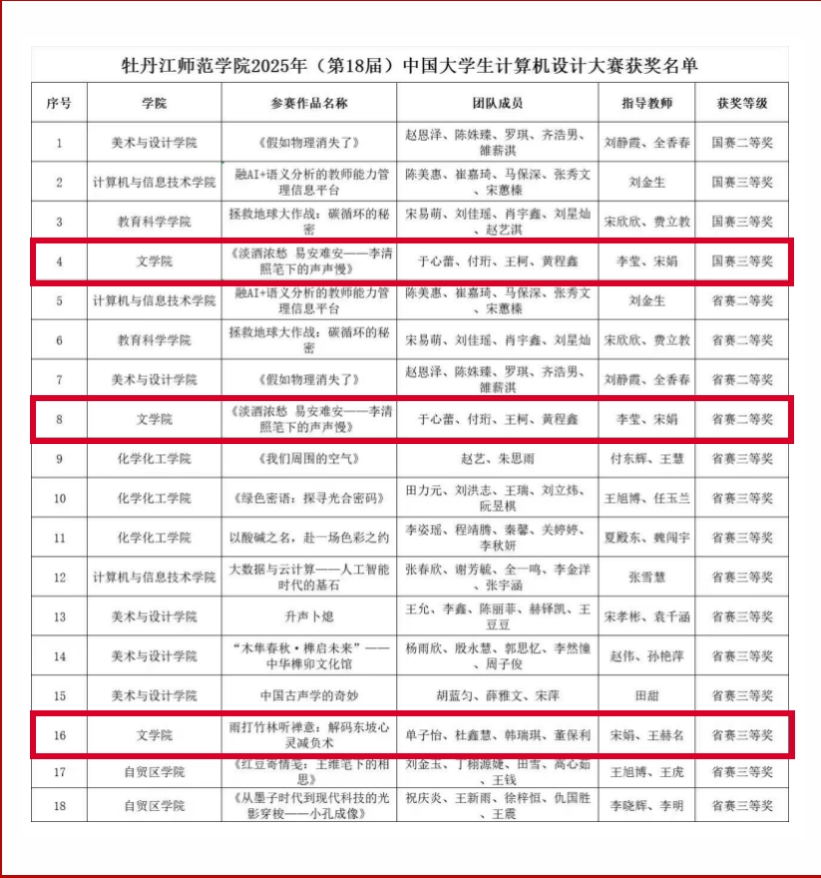 近日,2025年(第18届)中国大学生计算机设计大赛(4C2025)全国总决赛圆满落下帷幕。经校级、省级、国家级层层筛选与激烈角逐,文学院两项作品最终斩获国家级奖项1项、省级奖项2项。