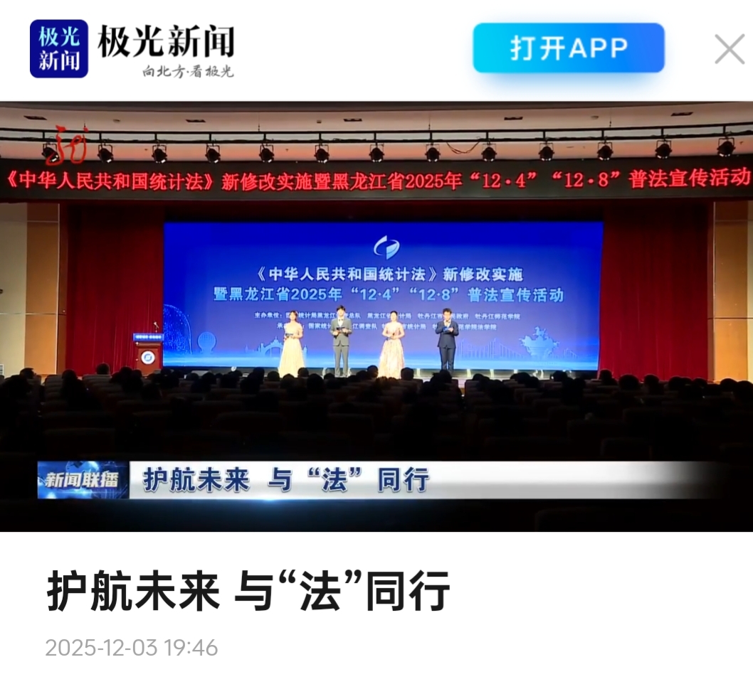 2025年是习近平法治思想被确定为全面依法治国的指导思想5周年,是“八五”普法总结验收年,也是《中华人民共和国统计法》新修改实施1周年。12月3日上午,由国家统计局黑龙江调查总队、黑龙江省统计局、牡丹江市人民政府、牡丹江师范学院主办,国家统计局牡丹江调查队、牡丹江市统计局、牡丹江市司法局、牡丹江师范学院法学院承办的《中华人民共和国统计法》新修改实施暨黑龙江省2025年“12·4” “12·8”普法宣传活动在教师教育实训楼报告厅举行。