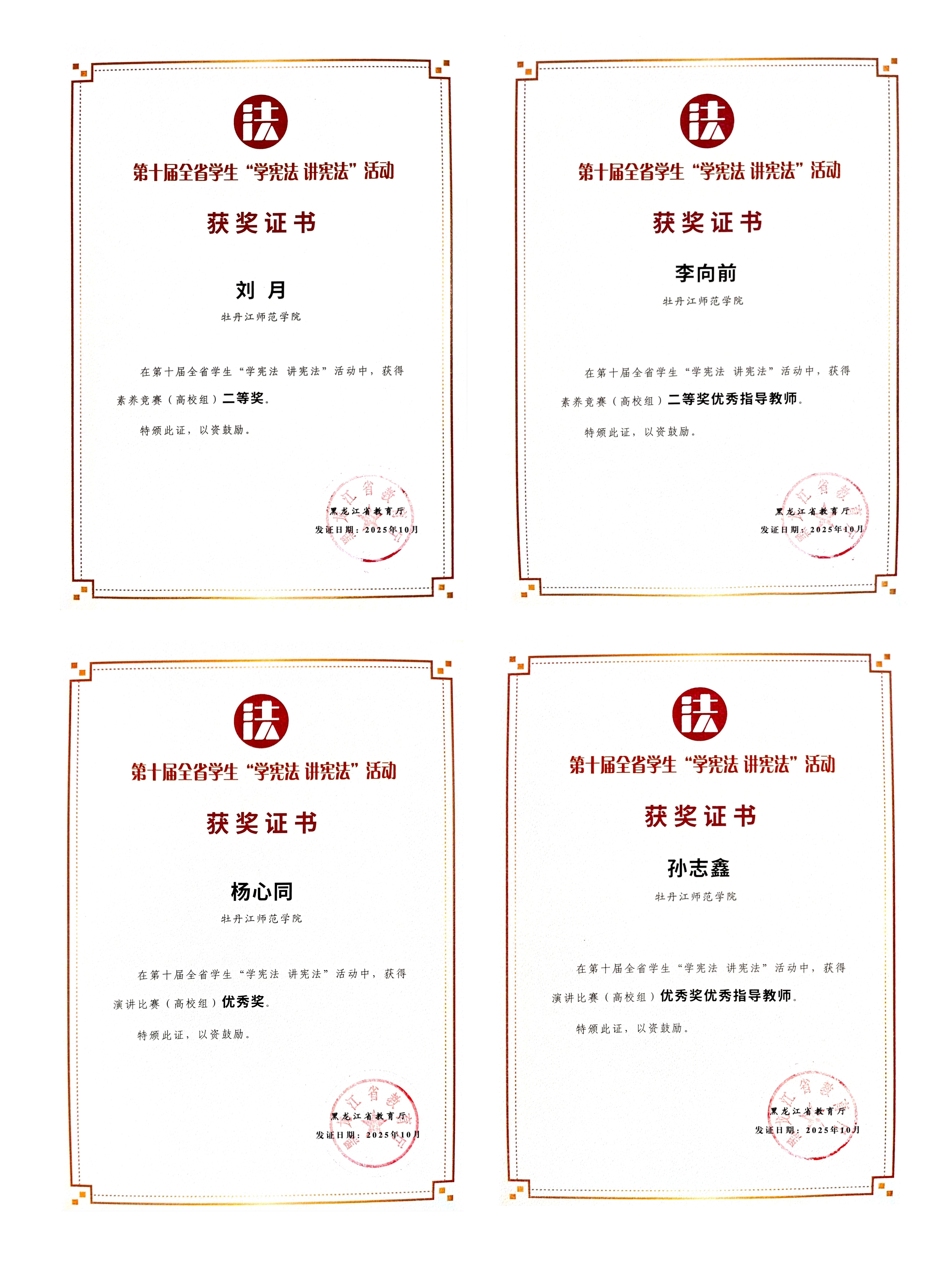 为深入学习贯彻习近平法治思想,推动青少年宪法宣传教育常态化长效化,2025年10月18日,由黑龙江省教育厅主办的第十届全国学生“学宪法 讲宪法”活动黑龙江省赛区总决赛在黑龙江大学成功举办。经过激烈比拼,我校法学院学子凭借扎实的专业功底与出色的表达能力崭露头角,荣获二等奖1项、优秀奖1项。