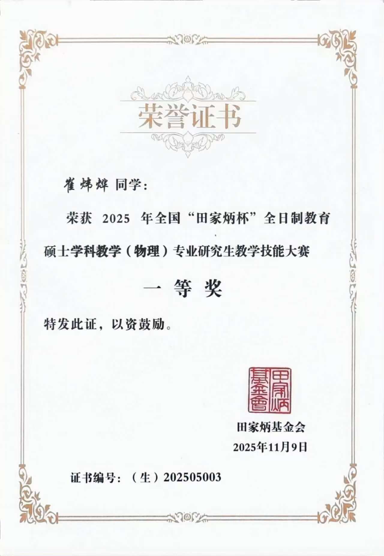 喜报!我校学子在2025年全国“田家炳杯”全日制教育硕士专业学位学科教学(物理)专业研究生教学技能大赛决赛中喜获一等奖