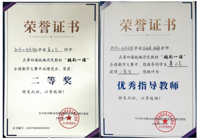 近日,由教育部中小学(中职)历史国家教材建设重点研究基地主办,东北师范大学历史文化学院承办的第四届统编历史教材“精彩一课”全国教学大赛暨义务教育历史教材研究高端论坛落下帷幕。我校历史与文化学院2021级历史学专业董子艺同学荣获二等奖,教师庞丽娟、张静荣获优秀指导奖。