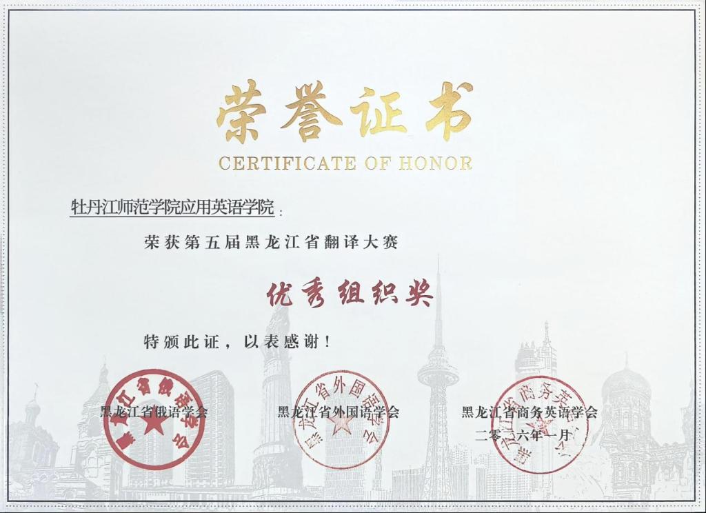 近日,第五届黑龙江省翻译大赛圆满落幕。我校应用英语学院、西方语言学院、东方语言学院、计算机与信息技术学院师生在大赛中表现优异,共斩获特等奖1项、一等奖1项、二等奖2项、三等奖8项,应用英语学院荣获“优秀组织奖”。