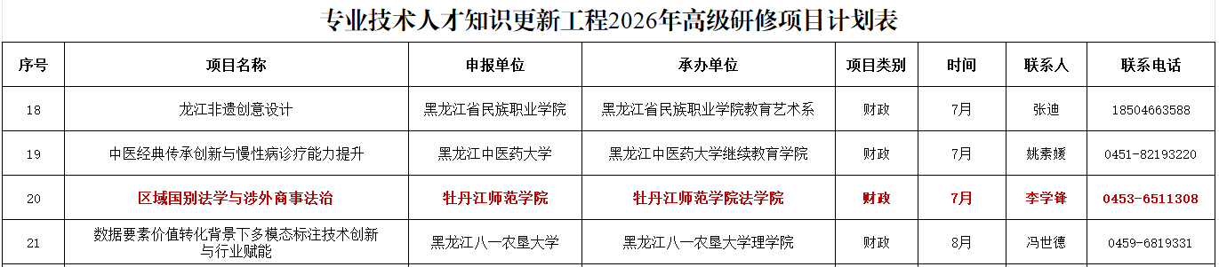 近日,黑龙江省人力资源和社会保障厅正式印发《关于公布专业技术人才知识更新工程2026年国家级和省级高级研修项目计划的通知》。我校申报的《区域国别法学与涉外商事法治》项目成功获批2026年省级高级研修项目,成为省级高级研修项目二十项之一,是我校作为黑龙江省专业技术人员继续教育基地取得的一次重大突破。