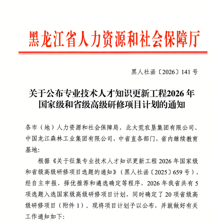 2026年专业技术人才知识更新工程高级研修项目是省级层面培养高层次、急需紧缺人才的核心举措,学校将以此项目获批为契机,依托黑龙江省专业技术人员继续教育基地,整合优质资源,紧扣龙江振兴战略需求,优化课程体系,创新研修模式,强化实践教学,打造精品项目,发挥示范辐射作用,助力全省各类专业技术人才能力持续提升,为龙江全面振兴高质量发展贡献牡师力量。